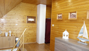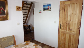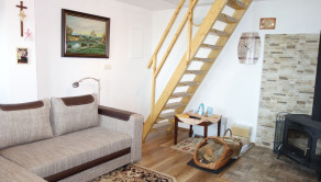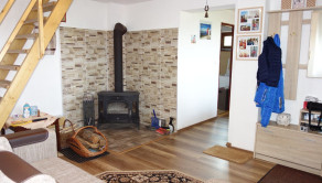 Dispozícia: Prvé podlažie: kuchyňa s jedálňou, obývacou izbou s krbom, kúpeľňa s WC a sprch. kútom (28 m2) + balkón (4 m2)