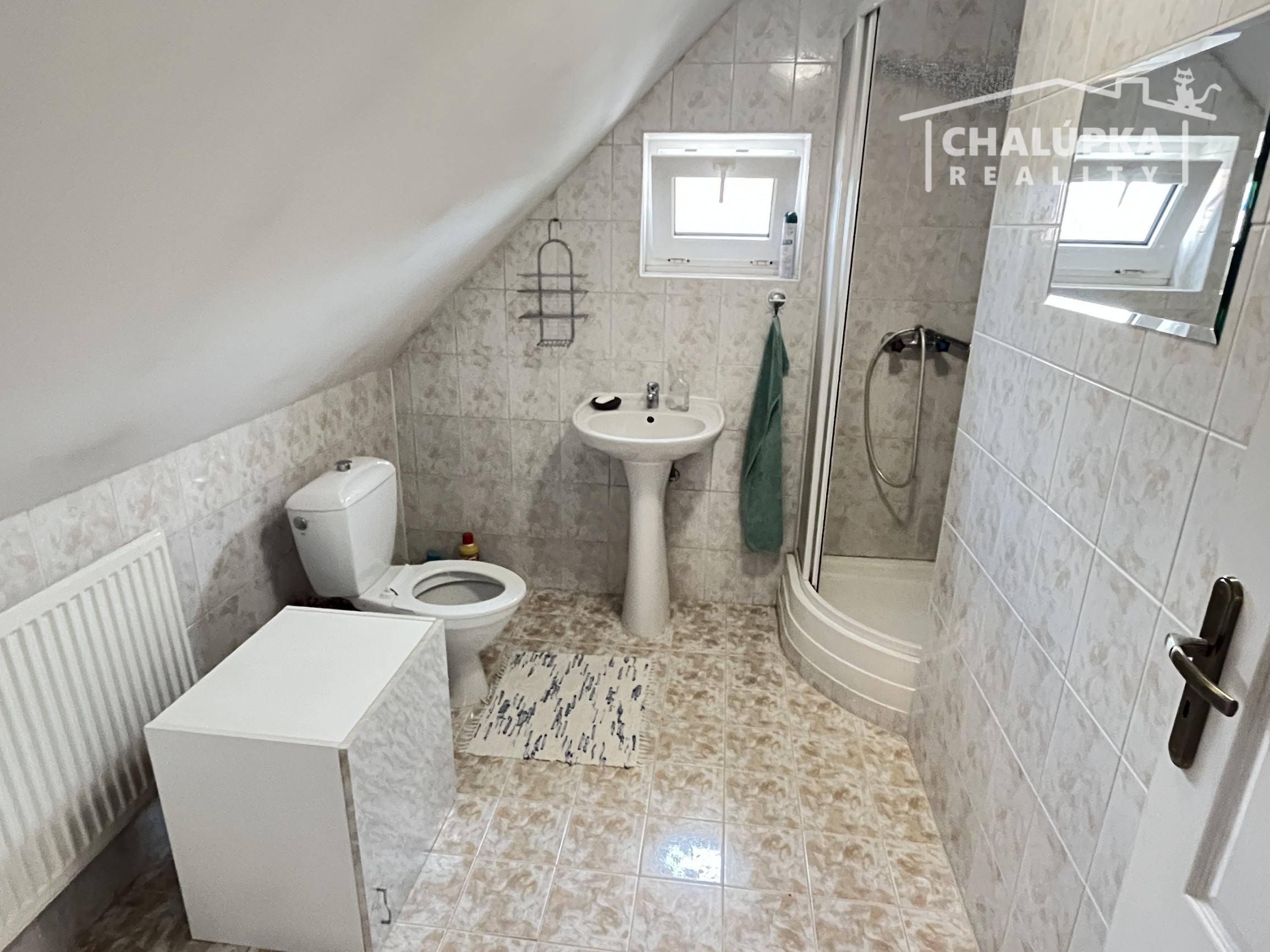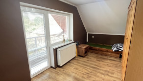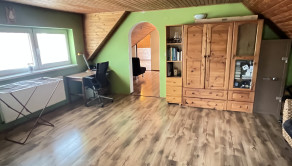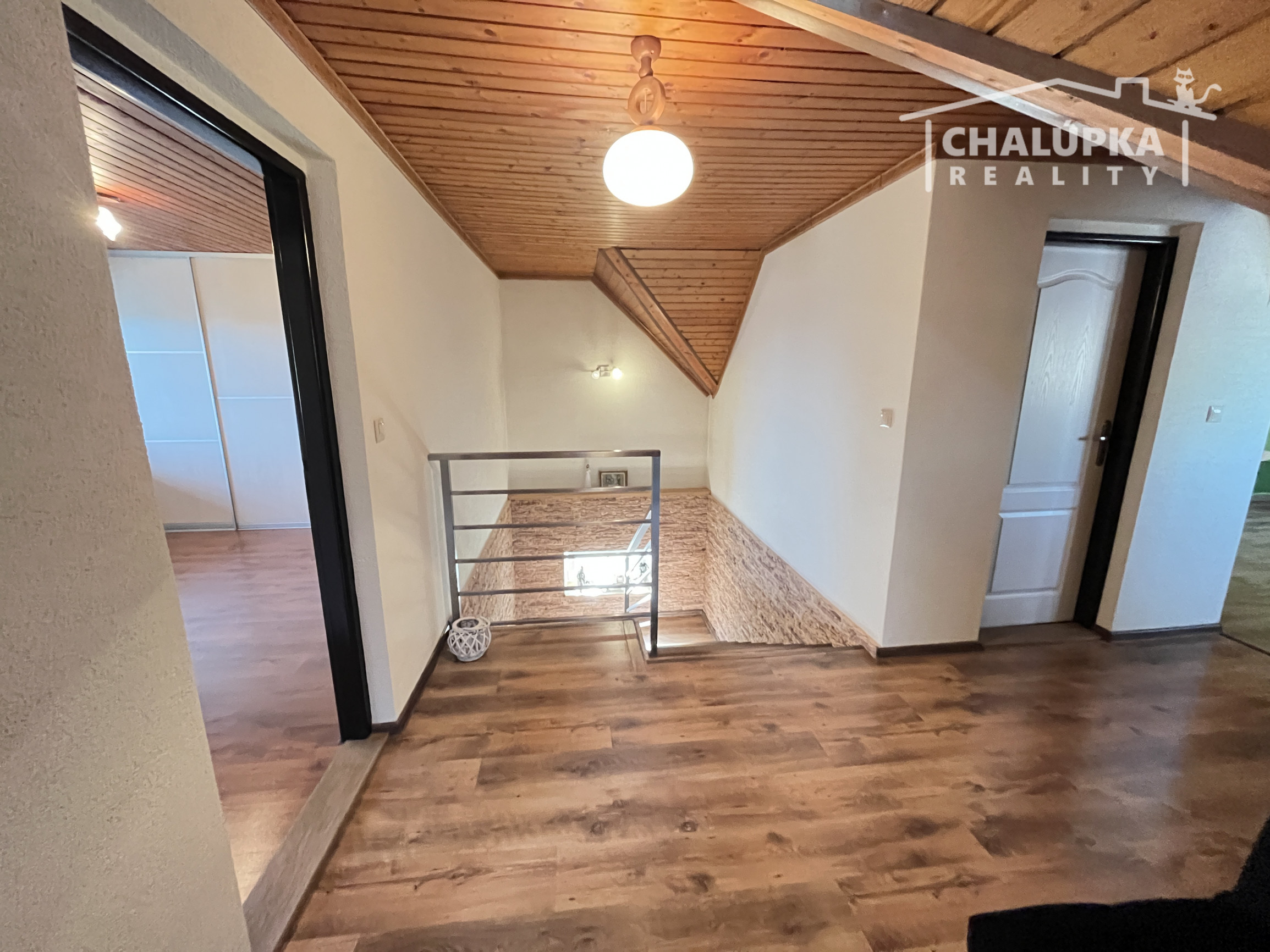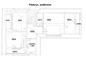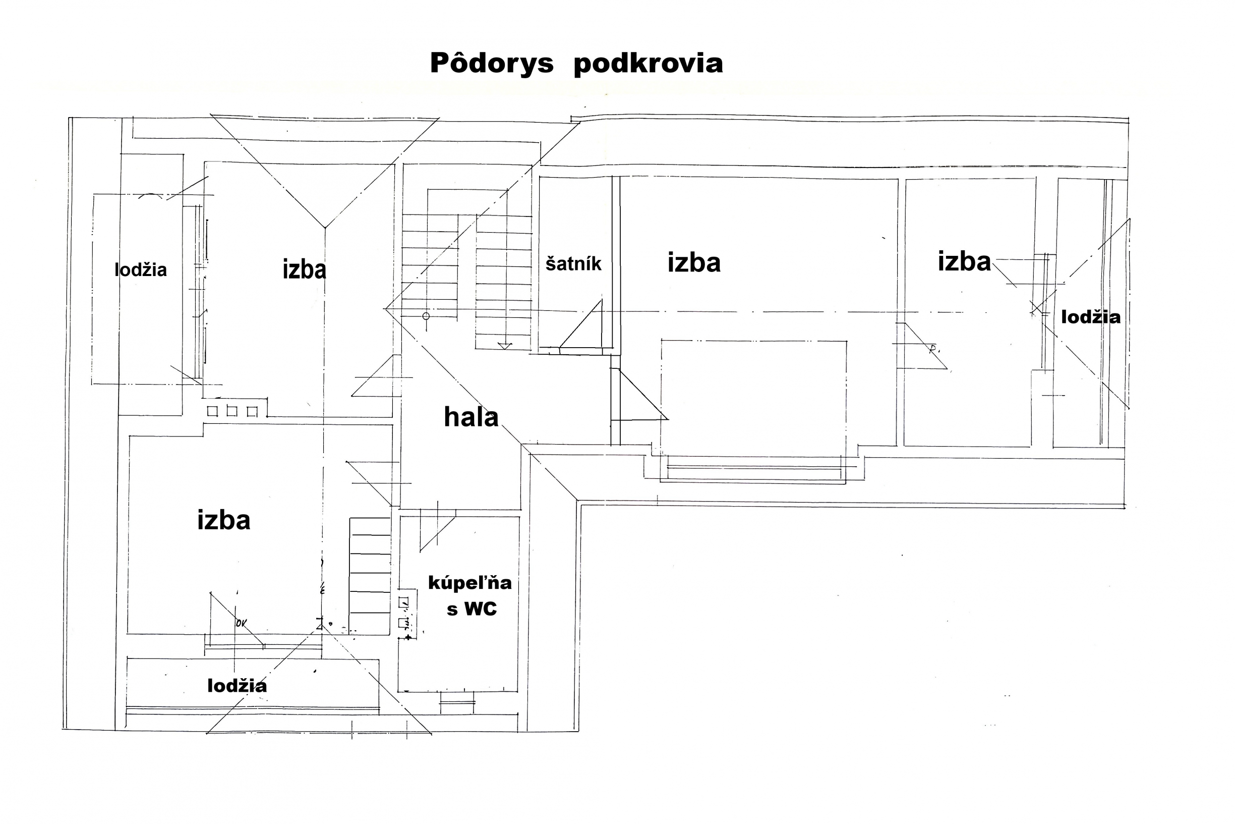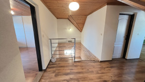 Poschodie: schodisko, hala, 4 spálne (z toho majú 3 výstup na lodžiu, z jednej je schodisko do povalových priestorov a v jednej z izieb je dovedená voda a odpad, takže je tu možnosť jednoduchým spôsobom spraviť ďalšiu kuchyňu) a šatník. Podlahová plocha poschodia je 103 m 2 + 12 m2 lodžie a cca 30 m2 povalových priestorov.