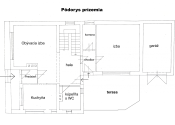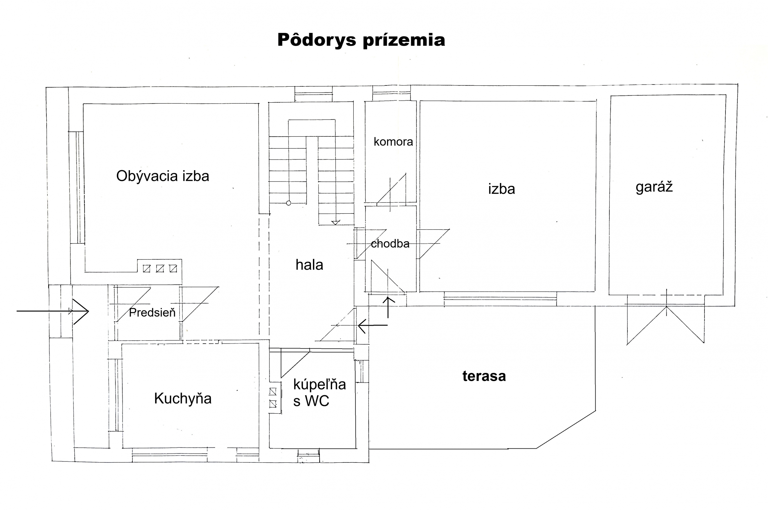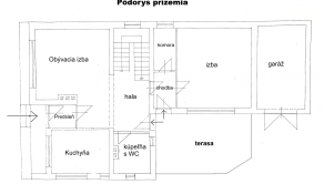 Prízemie: predsieň, hala, kuchyňa, kúpeľňa s wc, obývacia izba, schodisko, chodba s výstupom na terasu, komora, izba a garáž. Podlahová plocha prízemia je 112 m2 + 24 m2 terasa.