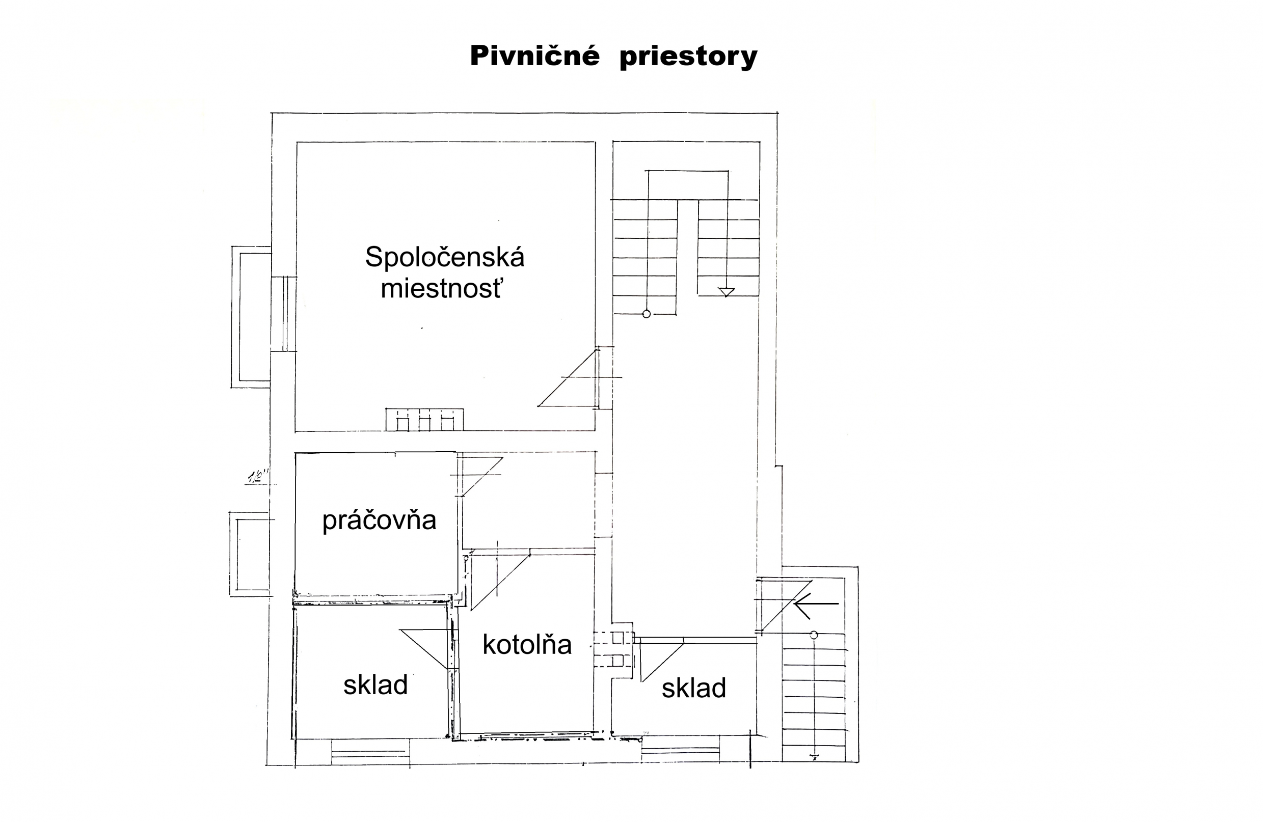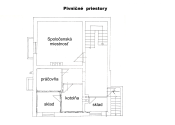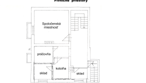 Pivičné priestory: schodisko, chodba, spločenská miestnosť, práčovňa, kotolňa, 2 sklady a výstup do exteriéru. Podlahová plocha pivničných priestorov je 56 m2.