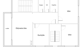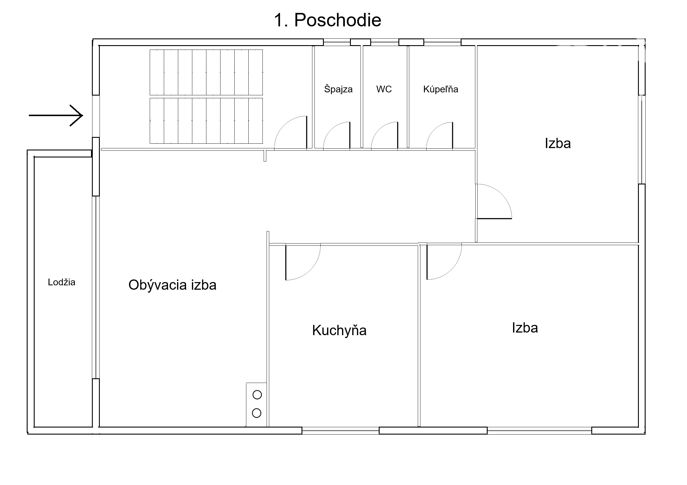 1. Poschodie: predsieň so schodiskom, hala, 2 izby, kuchyňa, špajza, samostatné wc, kúpeľňa, obývacia izba s výstupom na veľkú lodžiu. Podlahová plocha poschodia je 108 m2.
